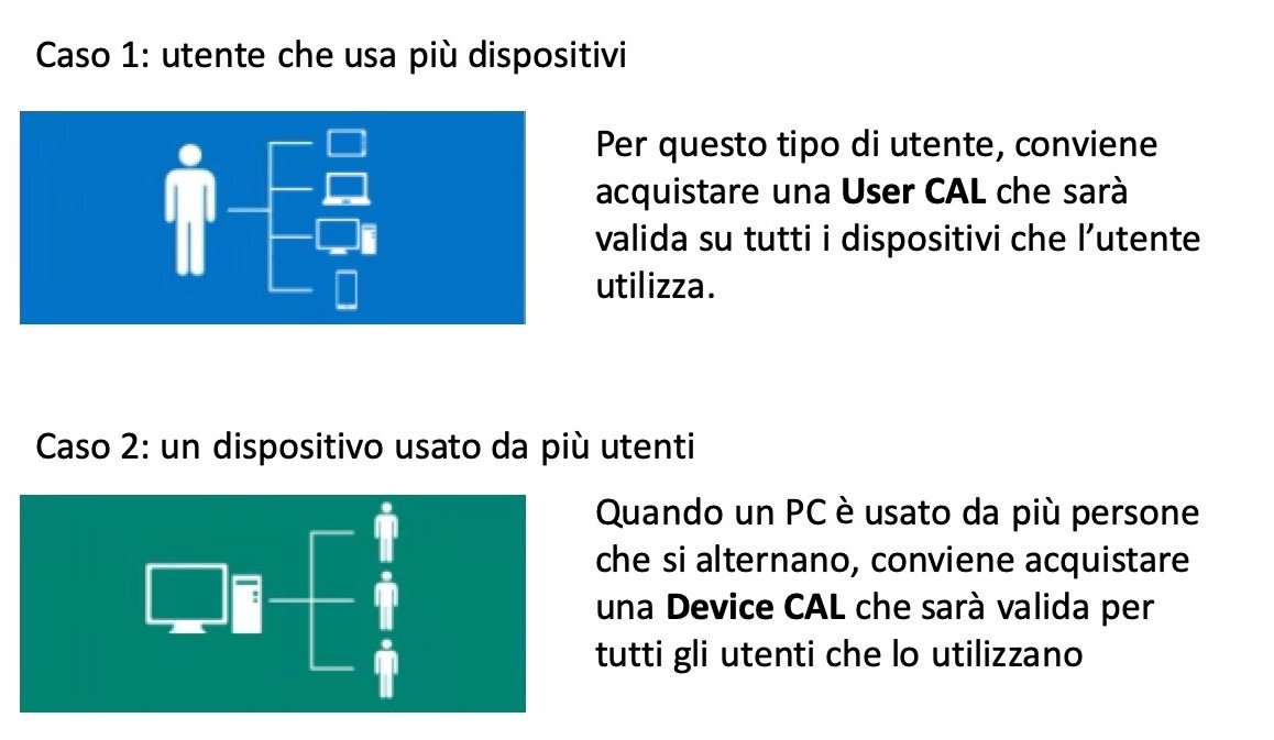 Per accedere ai servizi offerti da un server Microsoft o da un SQL Server, ad esempio, esistono utenti che hanno a disposizione più dispositivi: PC, MAC, ThinClient altro. In questo caso è più economico acquistare la User CAL. Quella licenza sarà agganciata ad quel certo nome utente (Active Directory Username) e potrà essere usata su un numero illimitato di dispositivi. Naturalmente se quella persona viene sostituita da un’altra persona, la licenza può essere revocata e riassegnata tramite una semplice console presente sul Server in oggetto del servizio erogato.
