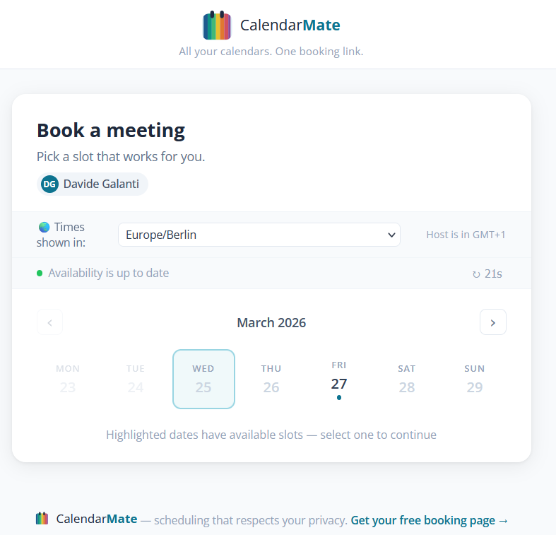 Ma cosa viene effettivamente trasmesso attraverso questo feed? Il feed ICS di Proton Calendar non espone i dettagli degli eventi: niente oggetto dell’appuntamento, nessun partecipante, nessuna nota allegata. Trasmette esclusivamente i blocchi temporali occupati, marcati come “busy”, ovvero impegnato. CalendarMate legge questi blocchi, incrocia le informazioni provenienti da eventuali altri calendari,se ci sono, e costruisce su questa base una pagina di prenotazione funzionante, operativamente analoga a quella che propone Calendly.